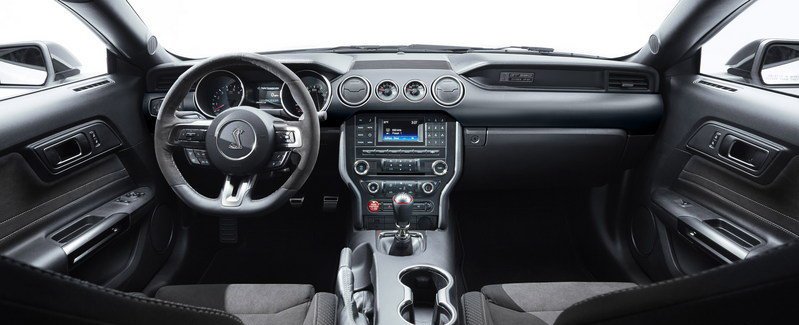 V zájmu bezpečí byl uvnitř kabiny snížen počet chromových detailů, které oslnily nejednoho řidiče. Kromě toho nabízí interiér velké množství prvků a ovladačů, informační technologií a bezpečnostních systémů, jako je ABS, řízení stability a kontrola trakce.2016-ford-mustang-gt350-4